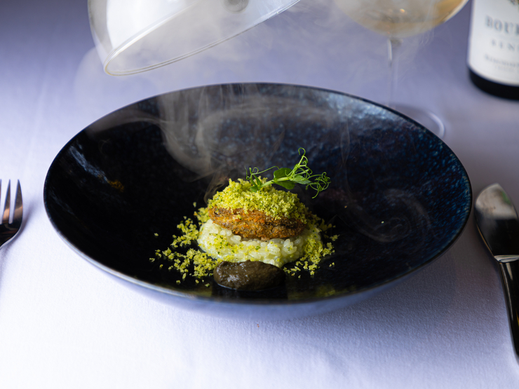 肉厚で柔らかい鮑が主役。プレートには苔を見立てたパセリのパン粉が散りばめられ、自然の美しさと調和した演出が施されています。クレソンのリゾットと鮑の肝のソースを添えて。美しさにも味わいにも魅了されます。