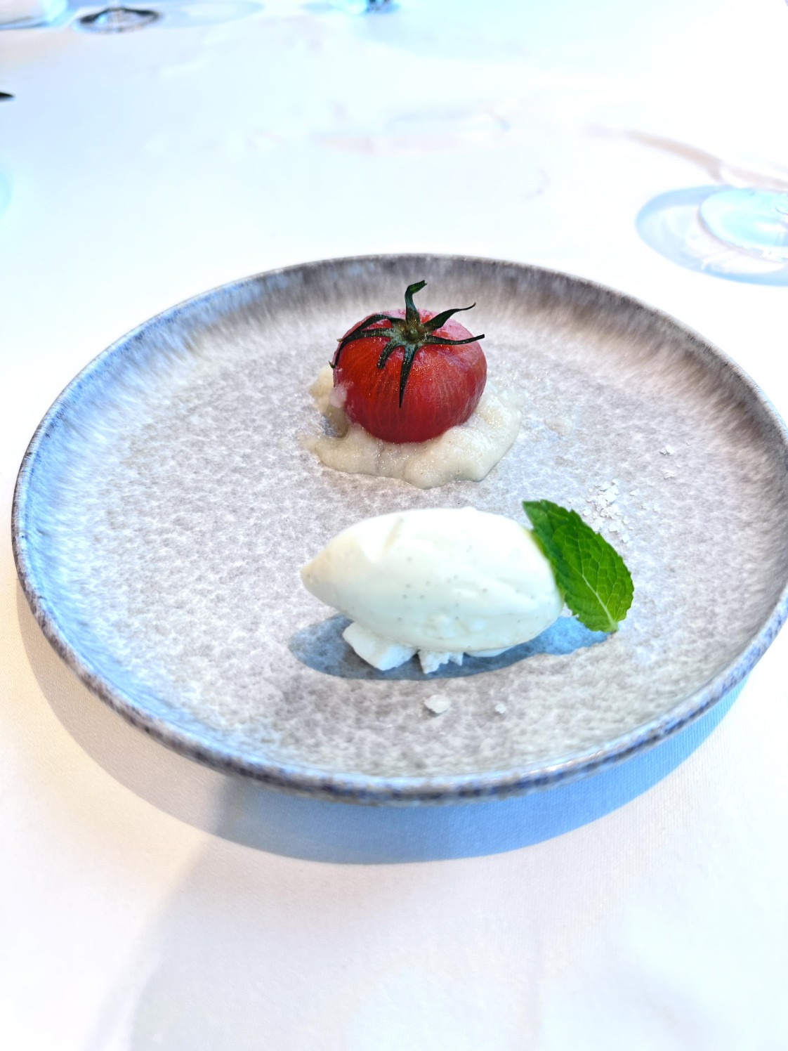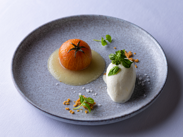 新鮮なトマトをローズマリーとレモンのシロップでコンポート。仕上げに焦がしバターのクリームを香らせると、さっぱりとしながらも深い味わいが感じられます。アイスとライチのジュレ、ビスケットクランチを添えて。